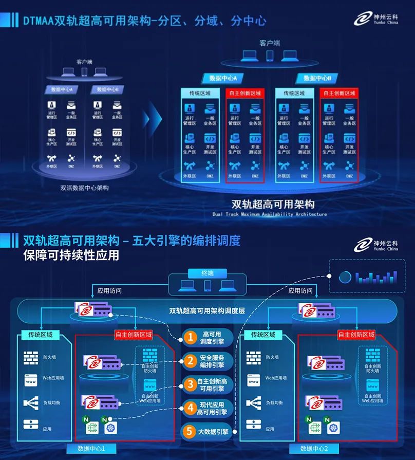 为助力银行业务高质量发展,更好地应对数字经济时代对可持续性的高要求,实现“信创”与“数字化”齐头并进,k8凯发创新性的推出了双轨超高可用架构。该架构在双活数据中心的分区调度基础上,增加信创域和非信创域的分域调度,实行信创域与传统域应用全量部署,使双中心运营变为双中心四区域并行运行,互为多活,将“0到1”的单轨建设道路变为分区分域协同的多活双轨超高可用架构。帮助客户在新架构下,保障“信创”的同时解决性能瓶颈,提升稳定性,保证应用可持续性,最终实现信创区域和非信创区域的平滑过渡,完成国产化替代目标。